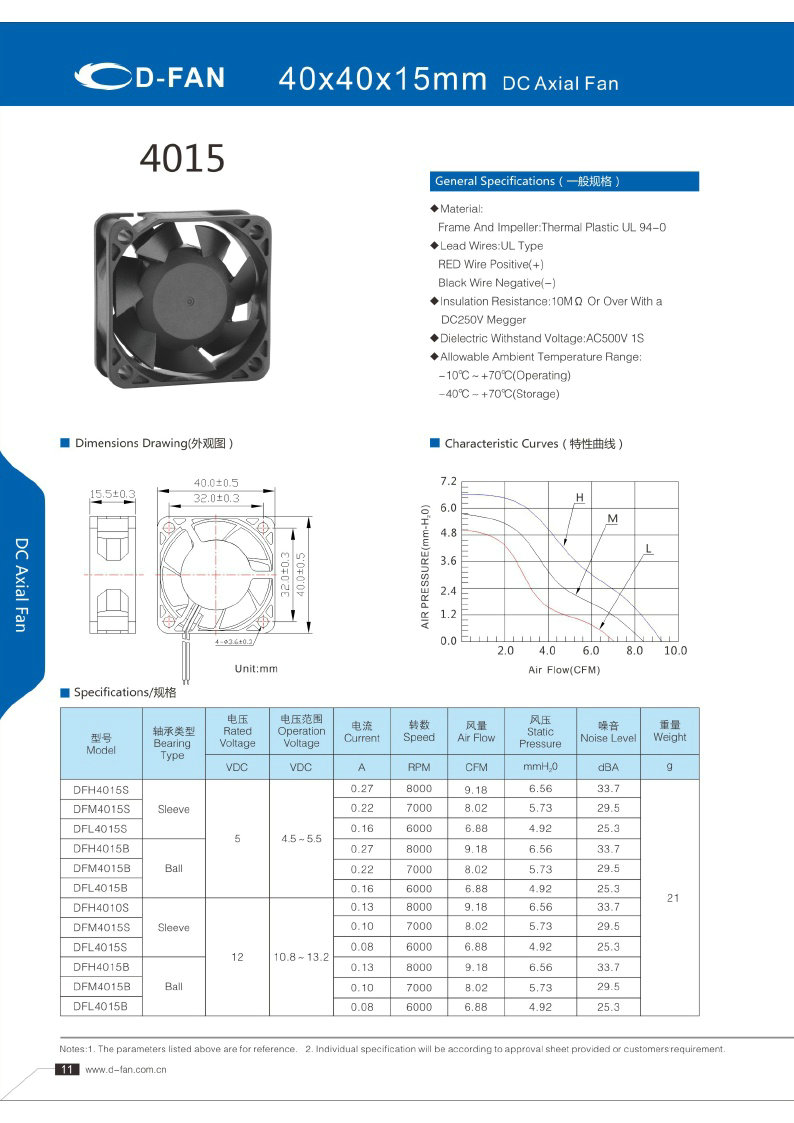 材料: 框架和葉輪:熱塑UL 94-0 引線.UL類型 紅色導線正極(+) 黑線負極(-) 絕緣電阻:10MΩ或以上,帶DC250V高阻表 介電耐壓:AC500V 1S 允許環(huán)境溫度范圍: -10℃-+70℃(運行) -40℃-+70℃(儲存)