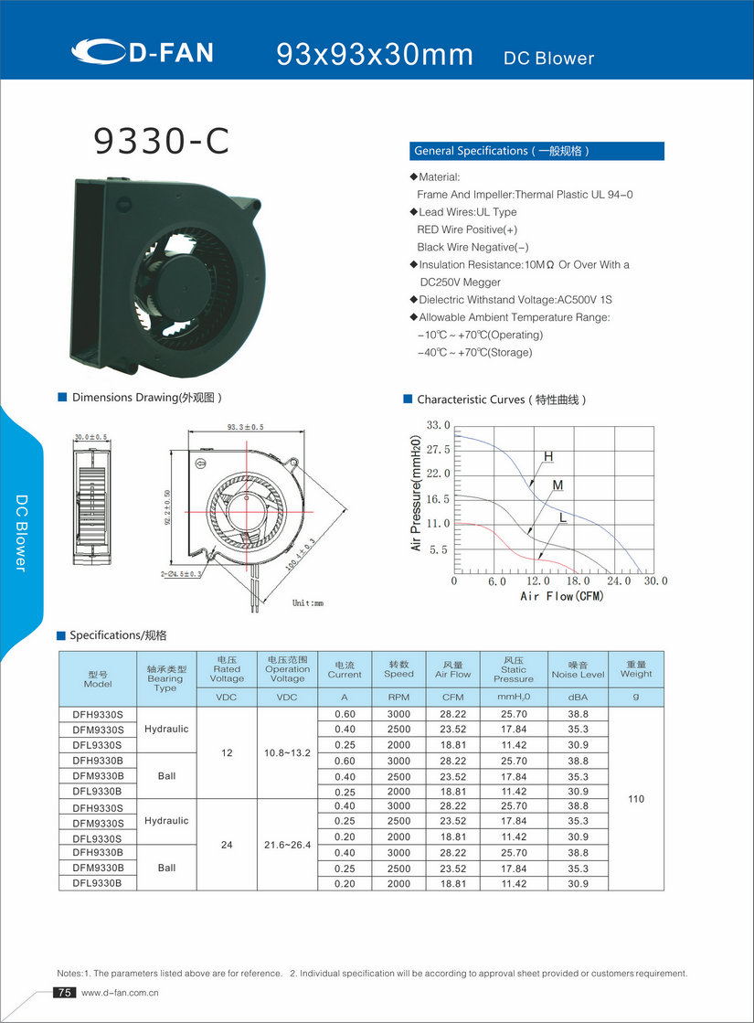 材料: 框架和葉輪:熱塑UL 94-0 引線:UL型 紅線正極(+) 黑線負極(-) 絕緣電阻:10MΩ或以上,帶DC250V高阻表 介質(zhì)耐壓:AC500V 1S 允許環(huán)境溫度范圍: -10℃~+70℃(運行) -40℃~+70℃(儲存)